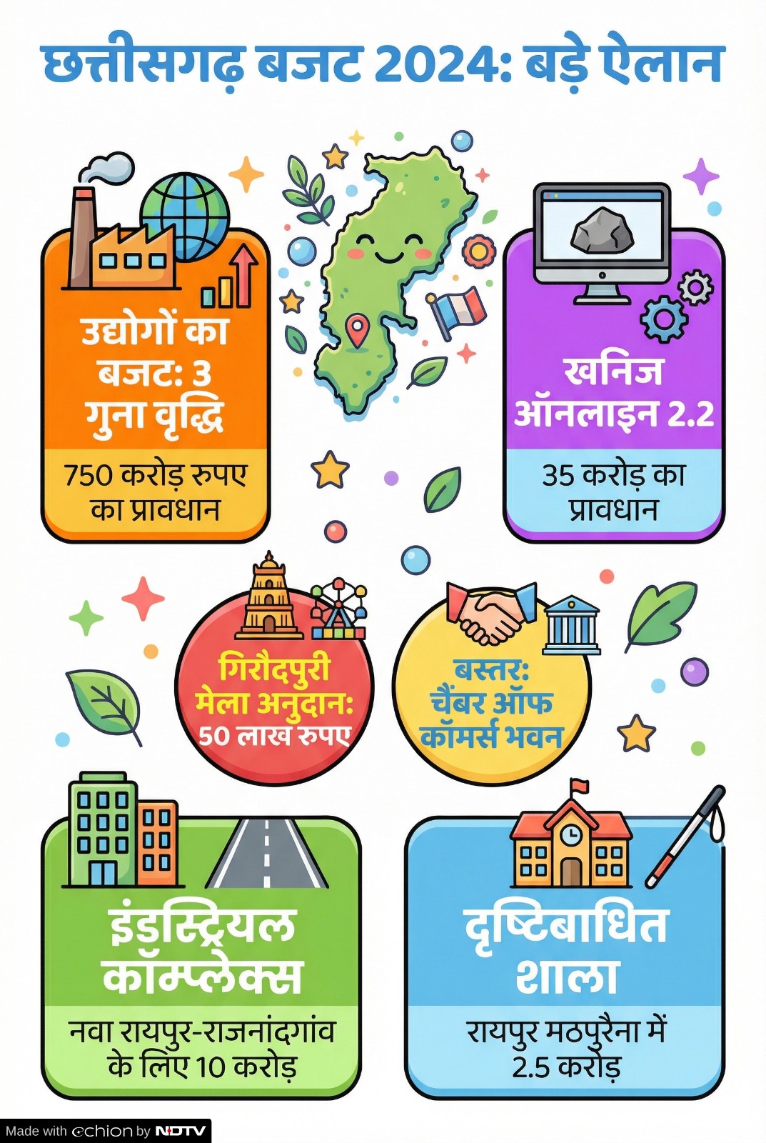 सशक्त माताएं, स्वास्थ्य, शिक्षित बच्चे, पोषण, युवा, किसान आदि पर फोकस किया गया. इस बजट में महतारी वंदन योजना के लिए 8,200 करोड़ रुपये का प्रावधान किया गया. वहीं सक्षम आंगनबाड़ी व पोषण के लिए 2,320 करोड़ का प्रावधान किया गया. बजट में किसानों को ब्याज मुक्त कर्ज देने की घोषणा की गई. वहीं 18 साल पूरे होने पर बच्चियों को डेढ़ लाख रुपए देने का प्रावधान किया गया है.
