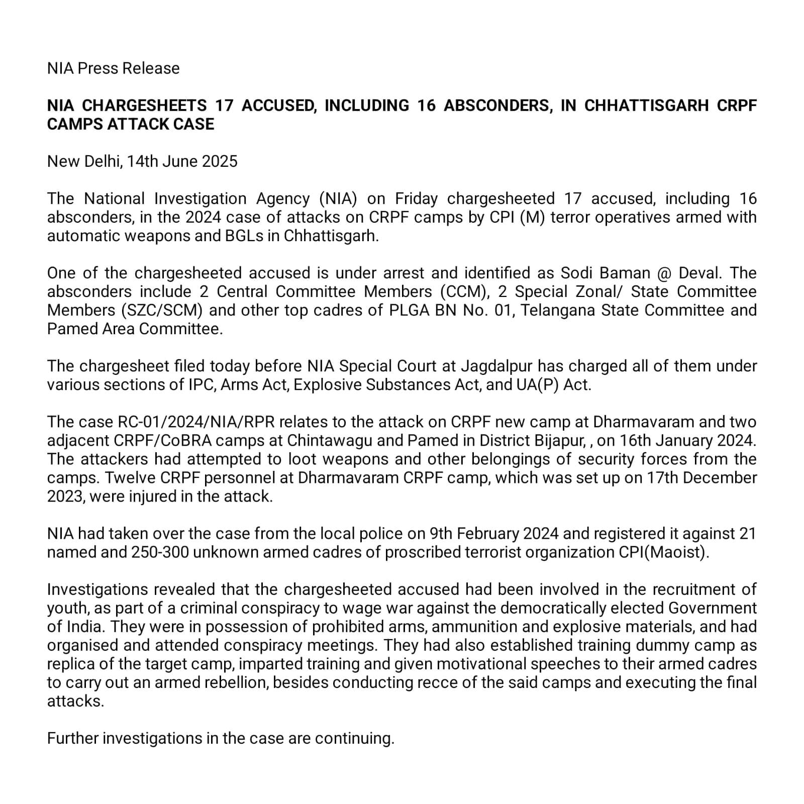 16 जनवरी 2024 को बीजापुर जिले के धर्मावरम में सीआरपीएफ के नए कैंप में माओवादियों ने हमला किया था. चिंतावागु और पामेड़ में सीआरपीएफ/कोबरा कैंप में भी हमले को माओवादियों ने अंजाम दिया था. आरोपी माओवादियों में से एक को गिरफ्तार कर लिया गया है और उसकी पहचान सोदी बामन उर्फ देवल के रूप में हुई है. जानकारी के अनुसार, फरार आरोपियों में दो केंद्रीय समिति सदस्य (सीसीएम), दो एसजेडसी और पीएलजीए बीएन नंबर 01, तेलंगाना राज्य समिति और पामेड क्षेत्र समिति के अन्य शीर्ष कैडर शामिल हैं.