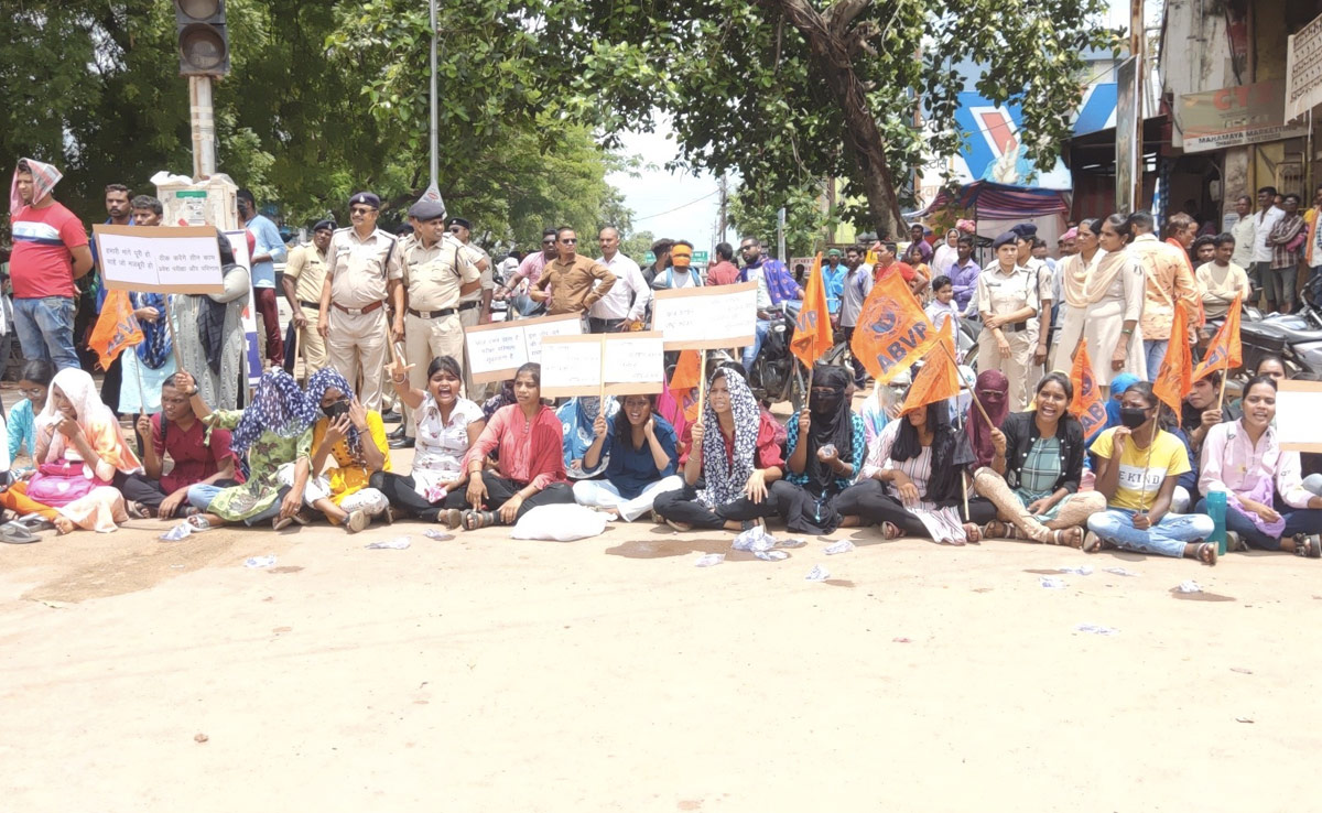 छत्तीसगढ़ के धमतरी में पंडित रविशंकर यूनिवर्सिटी परीक्षा परिणाम में गड़बड़ी के विरोध में छात्रों ने नेशनल हाइवे 30 पर चक्काजाम कर प्रदर्शन किया. जिला प्रशासन के खिलाफ छात्र-छात्रों ने जमकर नारेबाजी कर प्रदर्शन किया. बड़ी संख्या में एबीवीपी के छात्र-छात्राओं ने हाइवे के दोनो तरफ बैठकर किसी भी वाहन को जाने नही दिया. इस दौरान कई इमरजेंसी एंबुलेंस भी फंसी रही. प्रदर्शन के बीच जमकर बारिश भी हुई  लेकिन छात्र अपनी जगह पर डटे रहे.