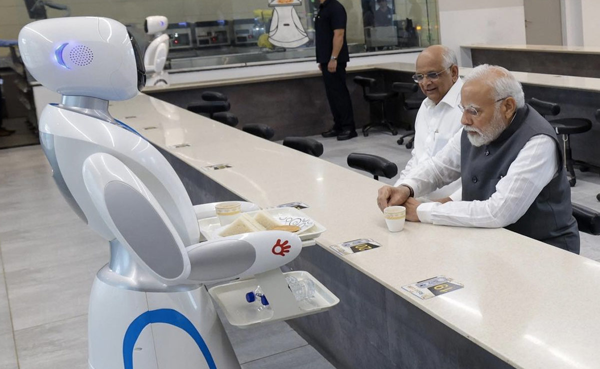 PM Modi in Gujarat Council Of Science City : प्रधानमंत्री नरेंद्र मोदी (PM Narendra Modi) बुधवार को गुजरात काउंसिल ऑफ साइंस सिटी पहुंचे. यहां जिस चीज ने उन्हें सबसे ज्यादा आकर्षित किया वे थे रोबोटिक्स गैलरी (Robotics Gallery) में रखे गए रोबोट्स. इनमें से एक रोबोट ने पीएम मोदी (PM Modi) को चाय भी परोसी. प्रधानमंत्री ने अपने इस दौरे की तस्वीरें इंस्टाग्राम (Instagram) पर शेयर की हैं.