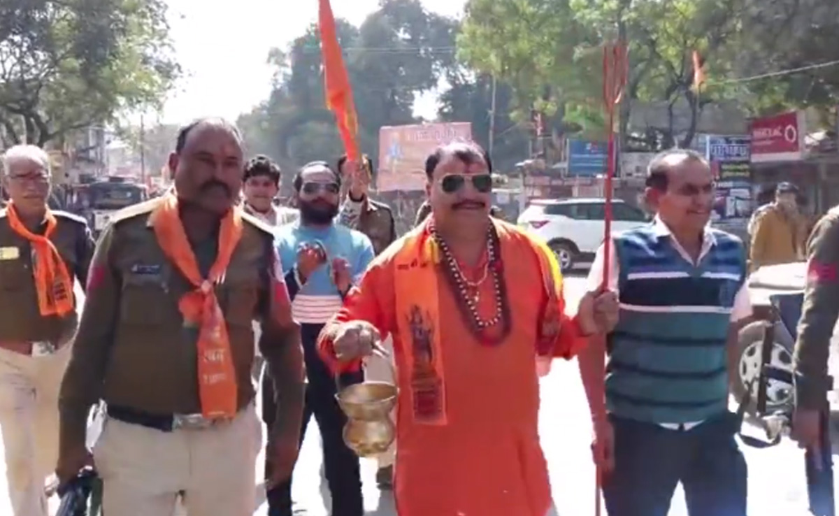राम लला प्राण प्रतिष्ठा के बाद शाजापुर के मक्सी थाने के प्रभारी भीम सिंह पटेल सोमवार को भगवा चोला पहनकर मक्सी की सड़कों पर घूमते दिखे. इस दौरान बाजार में कई लोग तो यह अंतर ही नहीं कर पाए कि यह कोई साधु संत हैं, या फिर पुलिस अधिकारी. भगवा चोला पहने एक हाथ में त्रिशूल और दूसरे हाथ में कमंडल लिए थाना प्रभारी भीम सिंह पटेल कई लोगों को आशीर्वाद देते भी दिखे. थाना प्रभारी के साथ थाने के कई पुलिसकर्मी भी इस दौरान मौजूद थे. ये पुलिसकर्मी भी अपने गले में भगवा पट्टा डाले नजर आए.