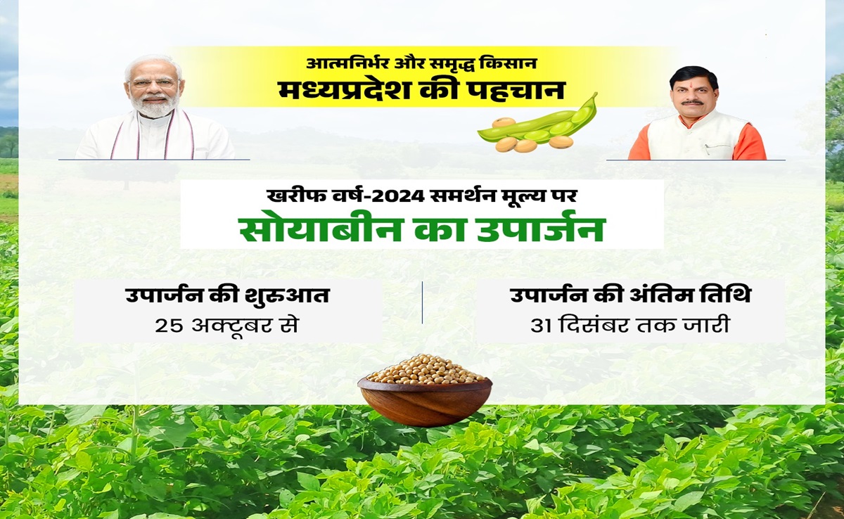 Soybean Procurement on MSP: मध्य प्रदेश के मुख्यमंत्री डॉ मोहन यादव (CM Mohan Yadav) ने कहा है कि समर्थन मूल्य (MSP) पर सोयाबीन (Soybean Procurement) की खरीदी शुक्रवार 25 अक्टूबर से 1400 केन्द्रों पर प्रारंभ होगी. सभी संबंधित अधिकारी सोयाबीन उपार्जन की कार्यवाही संवेदनशीलता से करें. उन्होंने कहा कि केन्द्र सरकार द्वारा निर्धारित मात्रा के अतिरिक्त सोयाबीन का उपार्जन प्रदेश सरकार करेगी. मुख्यमंत्री डॉ. यादव ने कहा कि प्रदेश में 25 सितम्बर से 20 अक्टूबर तक ई-उपार्जन पोर्टल (E Uparjan Portal) पर किसानों (Farmers) के पंजीयन का काम किया गया, जिसमें 3 लाख 44 हजार किसानों ने पंजीयन करवाया है.