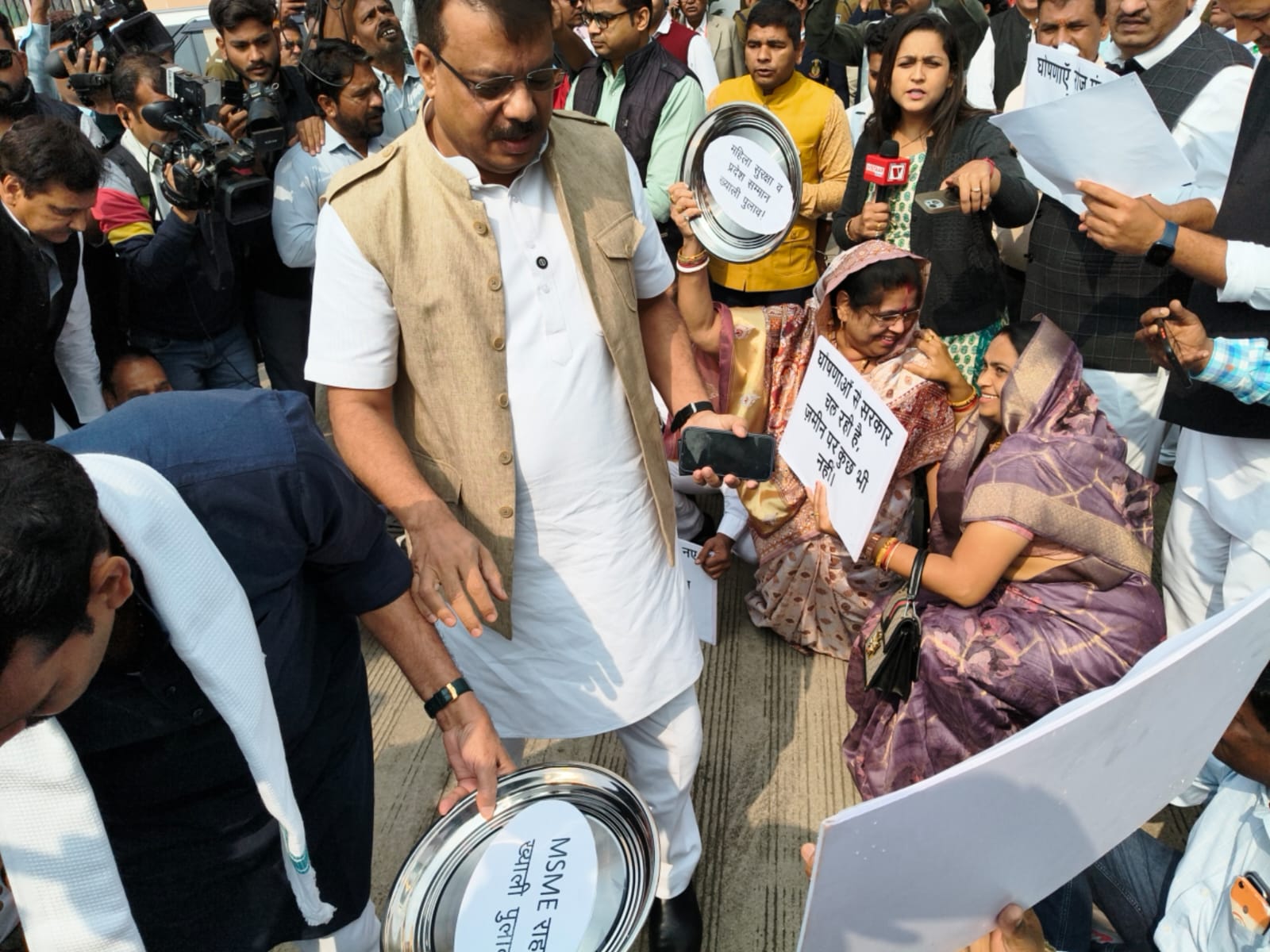 Madhya Pradesh Vidhan Sabha Budget Session: विधानसभा के बाहर थाली लेकर कांग्रेस विधायकों का पदर्शन