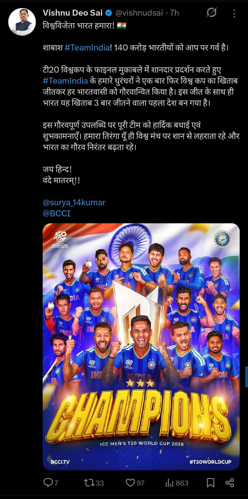 छत्तीसगढ़ के मुख्यमंत्री ने भी भारतीय क्रिकेट टीम को जीत की बधाई दी है. उन्होंने एक्स पर लिखा, टी20 विश्वकप के फाइनल मुकाबले में शानदार प्रदर्शन करते हुए टीम इंडिया के हमारे धुरंधरों ने एक बार फिर विश्व कप का खिताब जीतकर हर भारतवासी को गौरवान्वित किया है. इस गौरवपूर्ण उपलब्धि पर पूरी टीम को हार्दिक बधाई एवं शुभकामनाएं. हमारा तिरंगा यूं ही विश्व मंच पर शान से लहराता रहे और भारत का गौरव निरंतर बढ़ता रहे. जय हिन्द! वंदे मातरम्!