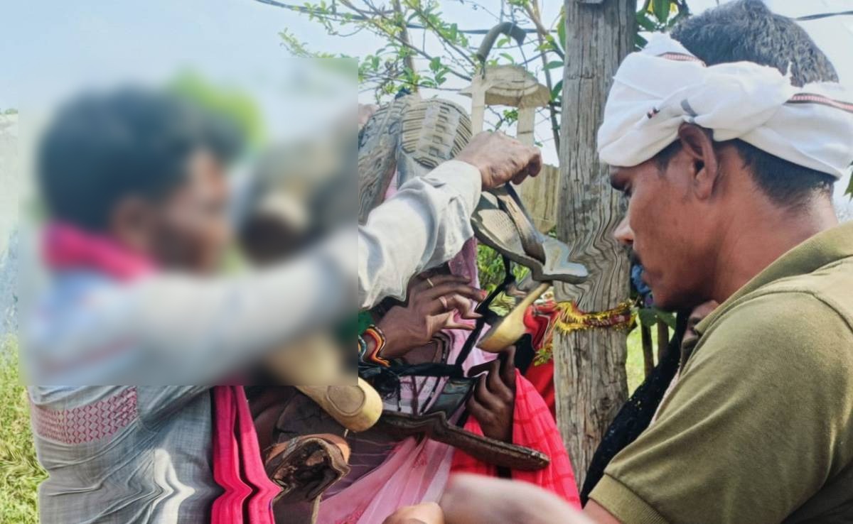 दोनों प्रेमी जोड़े को एक दूसरे के गले में जूते की वरमाला डलवाकर गांव में घुमाया गया