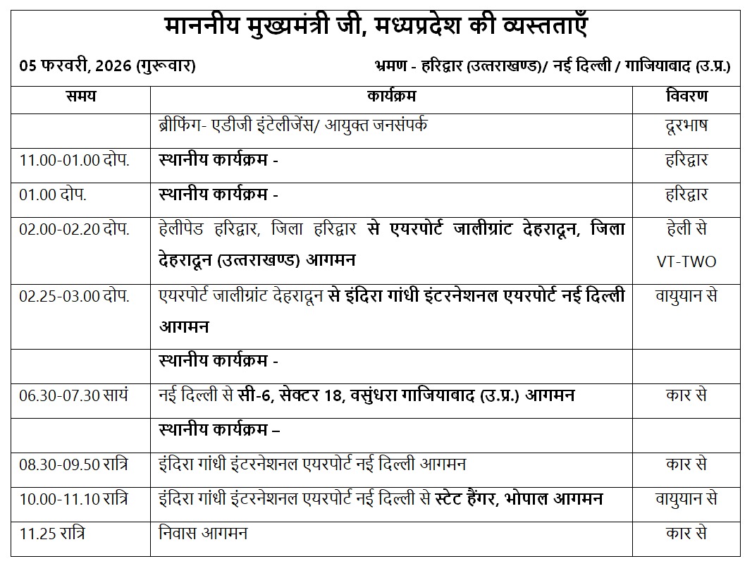 CM Mohan Yadav Visit Uttarakhand and Delhi: मुख्यमंत्री डॉ. मोहन यादव के आज यानी 5 फरवरी को उत्तराखंड और दिल्ली दौरे पर रहेंगे. हरिद्वार में वह स्थानीय कार्यक्रमों में शामिल होंगे. दोपहर 3 बजे देहरादून से दिल्ली पहुंचेंगे. दिल्ली में भी स्थानीय कार्यक्रमों में हिस्सा लेंगे. साथ ही वह यूपी में गाजियाबाद में कार्यक्रमों में शामिल होंगे. देर रात वह भोपाल लौट आएंगे.