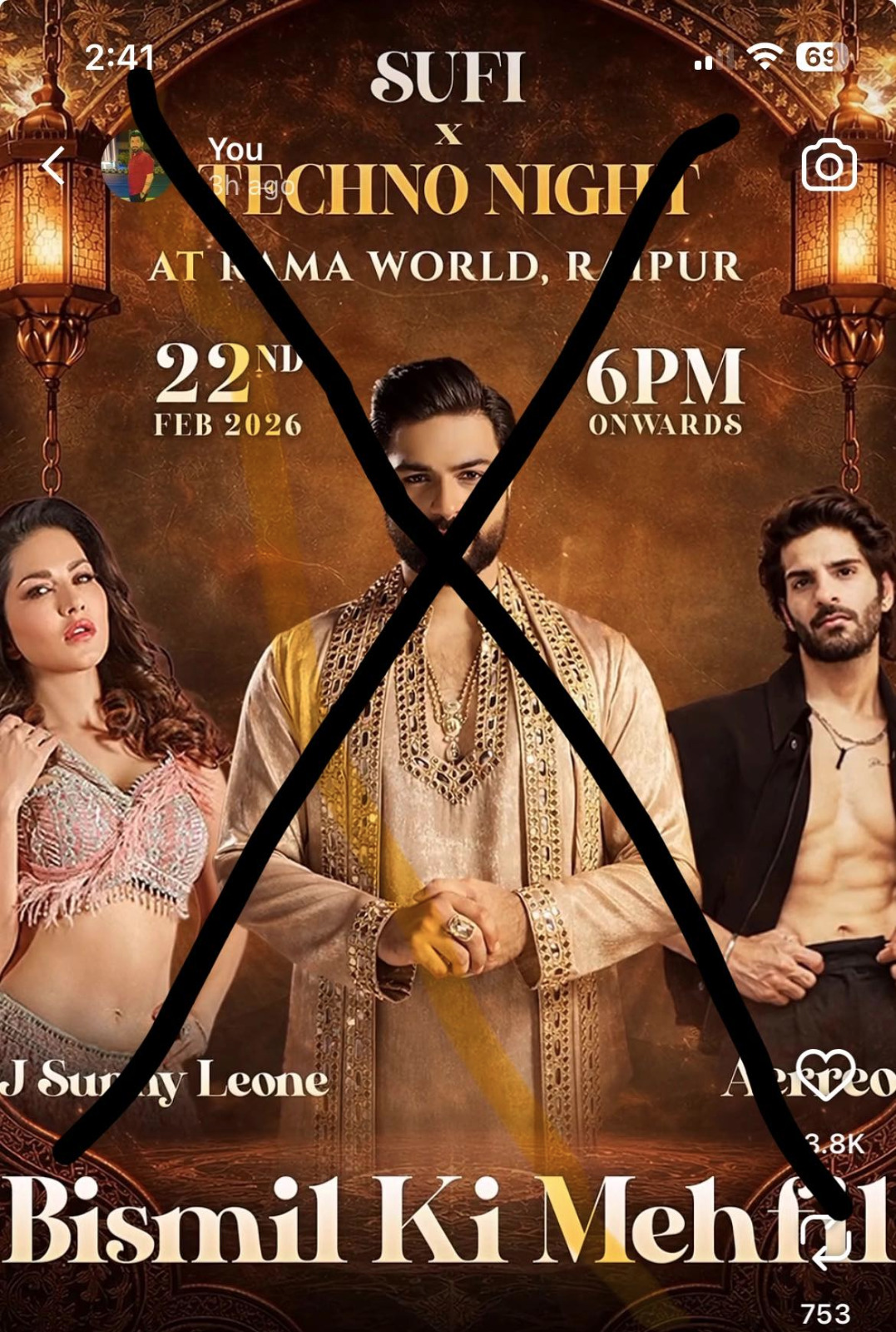 अभिनेत्री सनी लियोनी का एक कार्यक्रम 22 फरवरी को रायपुर में आयोजित है. इसकी जानकारी सनी लियोनी ने सोशल मीडिया पर दी है. बजरंग दल के इस विरोध के बाद कार्यक्रम को लेकर विवाद की स्थिति बन गई है. फिलहाल इस मामले में न तो जिला प्रशासन और न ही कार्यक्रम आयोजकों की ओर से कोई आधिकारिक बयान सामने आया है. वहीं सोशल मीडिया पर यह मुद्दा तेजी से चर्चा में बना हुआ है.