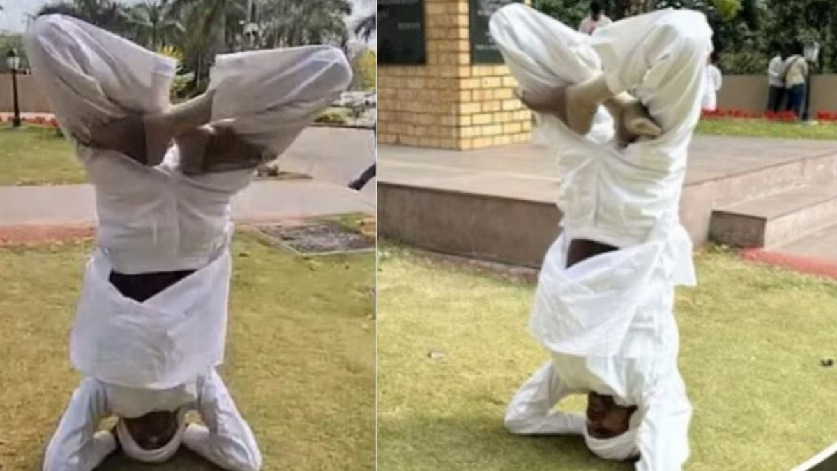 शिव बारात केस में दर्ज FIR से नाराज MLA बाबू जंडेल, गांधी प्रतिमा के सामने किया शीर्षासन