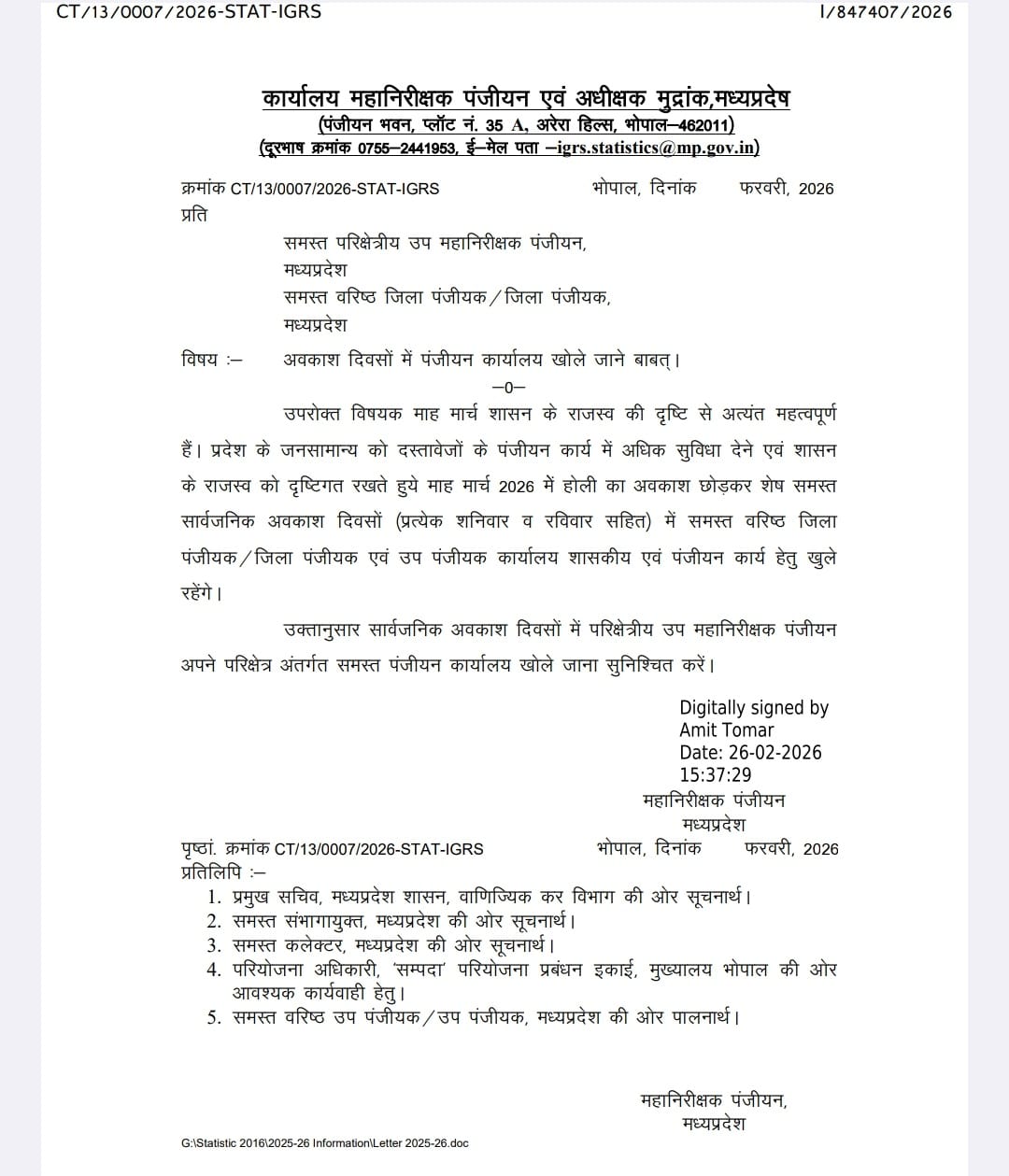 मध्यप्रदेश में मार्च में छुट्टी के दिन भी रजिस्ट्री खुलेंगी, होली को छोड़ शनिवार‑रविवार में रजिस्ट्रेशन की सुविधा