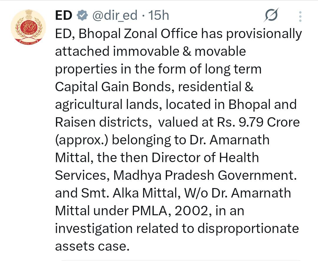 ED Attached Property of Former Health Director in Bhopal: मध्य प्रदेश की राजधानी भोपाल में पूर्व स्वास्थ्य संचालक की लगभग दस करोड़ की प्रॉपर्टी अटैच की गई है. ईडी (प्रवर्तन निदेशालय, ED) ने डॉ. अमरनाथ मित्तल (Dr Amarnath Mittal) और उनकी पत्नी अलका मित्तल की 9.79 करोड़ रुपये की चल-अचल संपत्ति को अस्थायी रूप से अटैच किया है. रायसेन और भोपाल में डॉ मित्तल ने पत्नी के नाम पर करोड़ों की संपत्ति खरीदी थी. ईडी की यह कार्रवाई मनी लॉन्ड्रिंग मामले में हुई. अटैच की गई संपत्तियों में लॉन्ग टर्म कैपिटल गेन बॉन्ड, आवासीय और कृषि भूमि शामिल हैं. ईडी भोपाल जोनल ऑफिस के अनुसार यह जांच लोकायुक्त पुलिस भोपाल द्वारा दर्ज एफआईआर के आधार पर की गई है.
