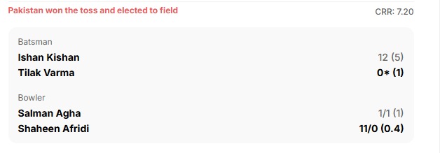 पाकिस्तान के शीर्ष तीन बल्लेबाजों ने मिलकर कुल 10 रन बनाए हैं - 0 (साहिबजादा फरहान), 6 (सैयम अयूब) और 4 (सलमान आगा)। टी20 विश्व कप के किसी मैच में पाकिस्तान के शीर्ष तीन बल्लेबाजों द्वारा बनाया गया यह सबसे कम स्कोर है, साथ ही भारत के खिलाफ भी उनका सबसे कम स्कोर है.