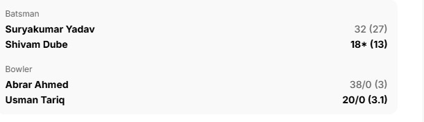 भारतीय कप्तान सूर्य कुमार यादव ने चौका मारा. उन्होंने मोहम्मद नवाज के गेंद पर चौका मारा. शादाब खान की फील्डिंग में चूक के चलते भारत को आसानी से चौका मिल गया. सूर्यकुमार यादव ने मोहम्मद नवाज की गेंद को बैकवर्ड स्क्वायर लेग की तरफ स्वीप किया. शादाब गेंद तक पहुंचने के लिए अच्छी दौड़े लेकिन उसे छोड़ दिया, जिससे चौका बर्बाद हो गया.