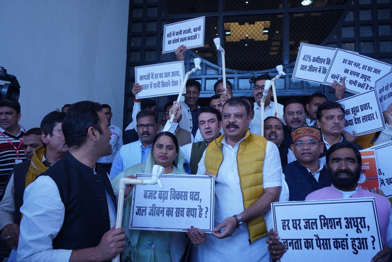 राज्य के शीतकालीन सत्र में कांग्रेस विधायक हर रोज विरोध प्रदर्शन दर्ज करा रहे हैं. राज्य की अर्थव्यवस्था को लेकर कांग्रेस विधायक कटोरा लेकर पहुंचे थे, खाद समस्या पर उनके हाथ में खाद की बोरी थी और बेरोजगारी के मुद्दे पर कांग्रेस विधायक चाय की केतली और गिलास लेकर विधानसभा परिसर में पहुंचे थे. सत्र के चौथे दिन गुरुवार को जल जीवन मिशन में हुए घोटाले का आरोप लगाते हुए नल की टोटी और पाइप लेकर पहुंचे.