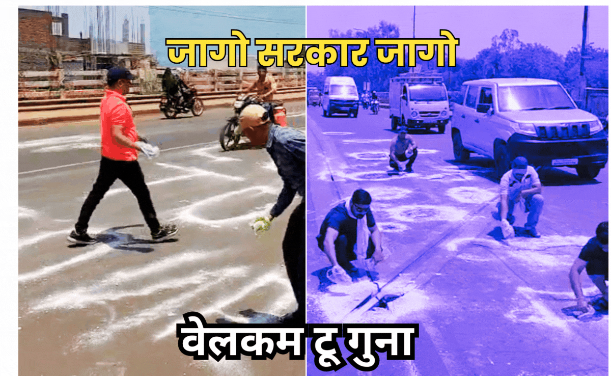 Protest Against Road With Potholes: गुना जिले के जर्जर रेलवे ओवरब्रिज के गड्ढोंं के प्रति सरकार को जगाने के लिए रविवार को युवाओं ने एक अनूठा प्रदर्शन किया गया. ओवरब्रिज पर बड़े-बड़े अक्षरों में वेलकम टू गुना लिखकर युवाओं ने व्यवस्था पर तीखा कटाक्ष किया है, ताकि जल्द 100 अधिक गड्ढे वाले सड़क की मरम्मत हो सके.