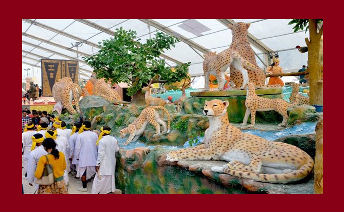 झांकी के मध्य भाग के पिछले हिस्से में पेड़ के नीचे बैठे “चीता मित्र'' स्थानीय निवासियों को चीता संरक्षण के बारे में प्रशिक्षित कर रहे हैं. झांकी के अंतिम भाग में वनकर्मी वाच-टॉवर से चीतों की निगरानी करते दिखाई दे रहे हैं, जो सफल चीता परियोजना में सक्रिय योगदान दे रहे हैं. झांकी के दोनों ओर एलईडी पेनल्स के माध्यम से कूनो राष्ट्रीय उद्यान में चीतों पर केन्द्रित फिल्म को भी प्रदर्शित किया जा रहा है. झांकी के दोनों ओर नृत्य दल श्योपुर जिले का सहरिया जनजाति नृत्य “लहंगी'' करते हुए नजर आयेंगे.