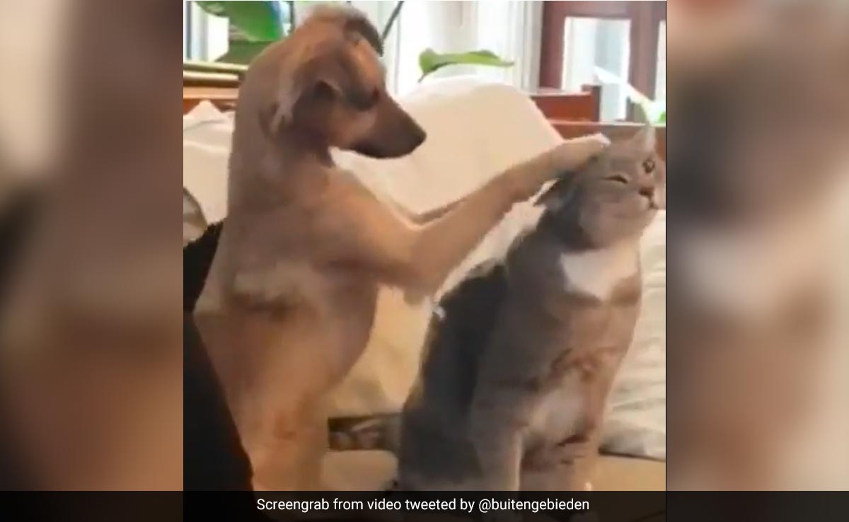 वायरल हो रहे वीडियो को एक्स हैंडल @buitengebieden द्वारा कैप्शन के साथ शेयर किया गया था, "कुत्ता बिल्ली को दुलार कर रहा है."
