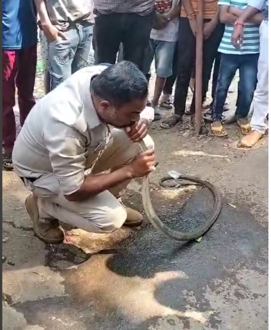 यह मामला नर्मदापुरम के सेमरी हरचंद की तवा कॉलोनी का बताया जा रहा है. जहां पुलिस कॉन्स्टेबल अतुल शर्मा मुंह से ऑक्सीजन देकर सांप को बचाते हुए दिखाई दे रहे हैं.