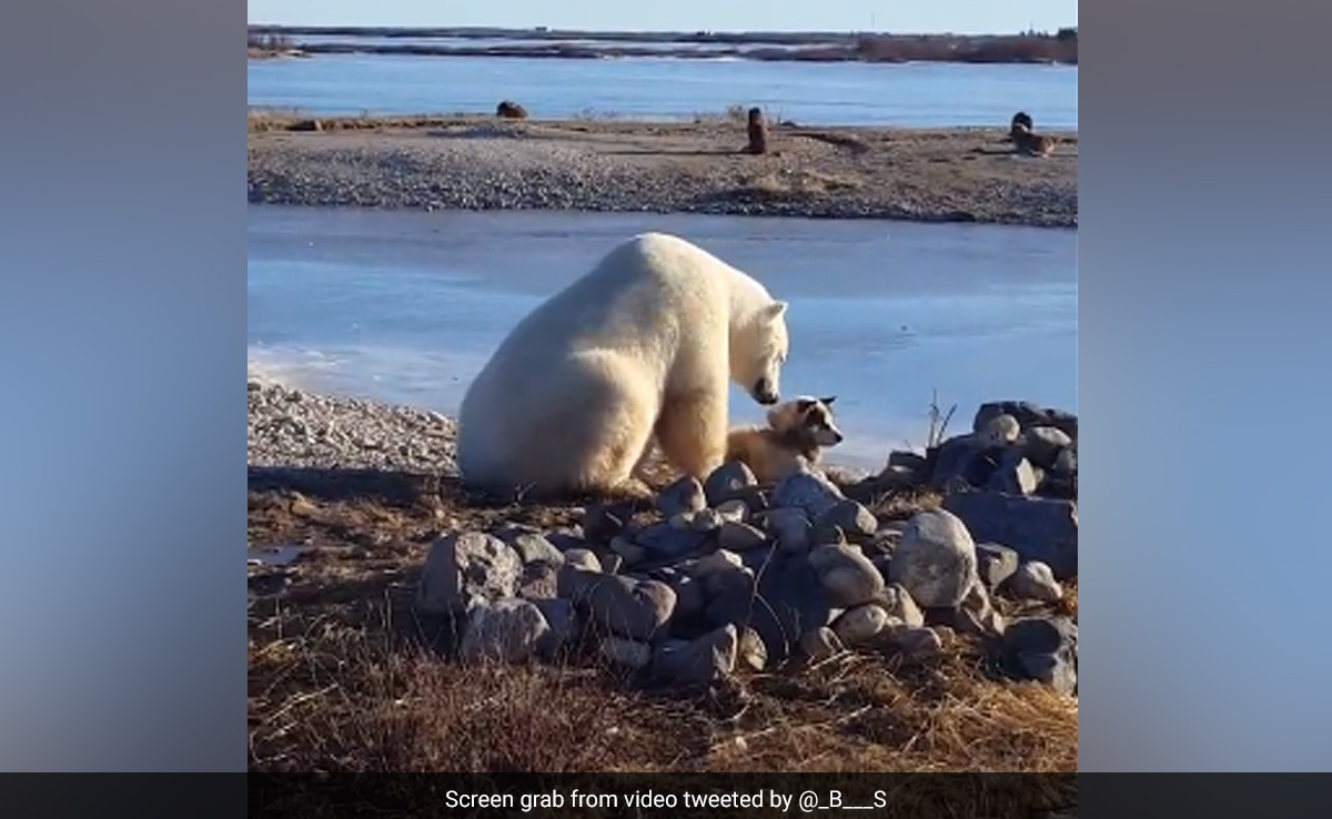 कुत्ते को अपने बच्चे की तरह दुलार करता दिखा पोलर बियर