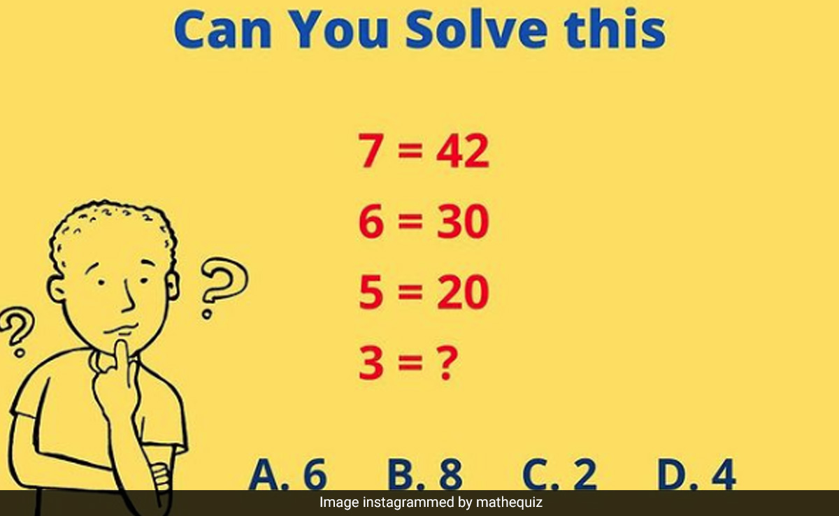इंस्टाग्राम पेज, mathequiz अक्सर कई तरह के ब्रेन टीज़र शेयर करता है जो बहुत से लोगों को आकर्षित करते हैं. पेज द्वारा शेयर किए गए नए चैलेंज में प्रश्न में लिखा है, "क्या आप इसे हल कर सकते हैं? अगर 7=42, 6=30, 5=20, तो संख्या 3 का मूल्य क्या होगा?" उन्होंने उत्तर चुनने के लिए चार विकल्प भी दिए हैं. ये चार विकल्प 6,8,2 और 4 हैं.